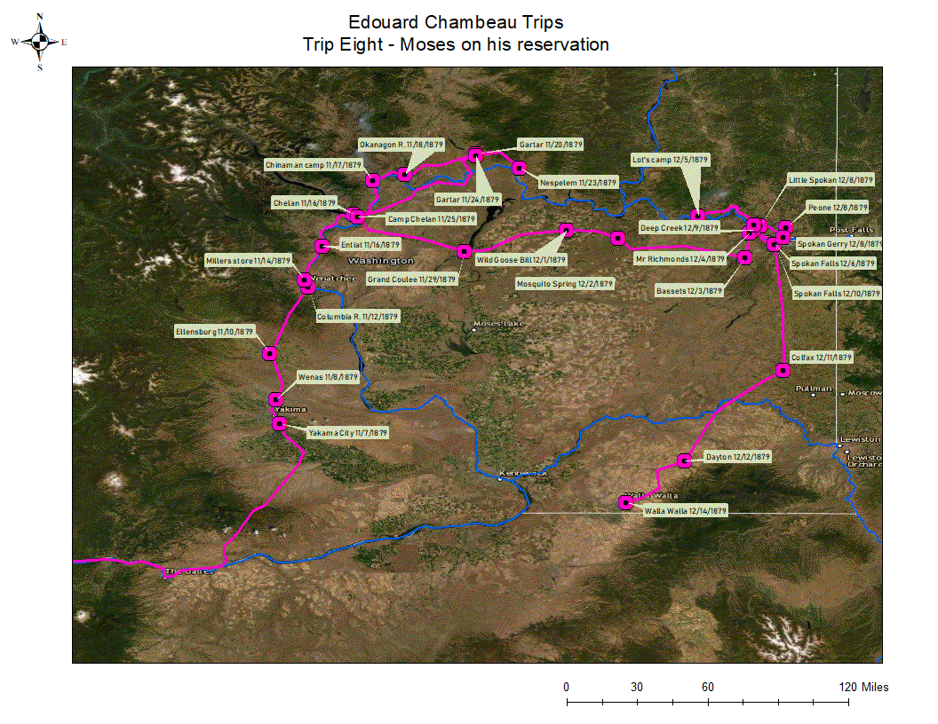 I am writing this in Moses wigwam Thursday(?) Dec 10. I crossed the Columbia last night with my guide Peter, and an Indian who came across for us in a canoe 16 feet long and 15 inches wide. It was all a man could do to get into it. When I got across I walked up to the camp which is close to the beach. The Indians were surprised to see a white man among them this time of year. In the wigwam, after I shook hands with three that were inside, I was told that Moses had gone to Simcoe reserve. I had expected him to have a talk with Wilbur, but not in this way. I had heard when I was at Yakama that Wilbur was too smart to go to Moses’ camp. How did Wilbur proceed? I will tell you. They had a talk at Simcoe and it was with difficulty he even got any of his Indians to go and tell Moses to come and see him.