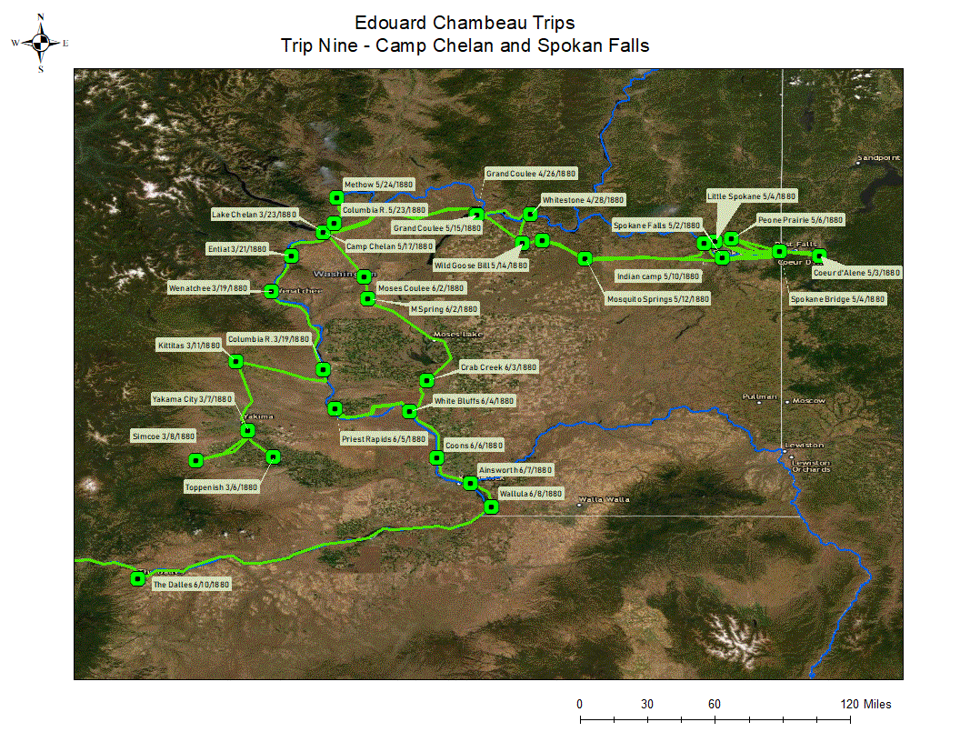 September 3. We came to where the Little Spokane empties into the big Spokane. At this place we met a number of Scull Hulls Indians. He and his people are not to say friendly. Some were gambling and others were standing around. They did not receive General Howard kindly. The reason of this is the leader of this band, Scull Hull, is a sullen and contrary man. From thence we traveled up the Little Spokane seeing Indians along the way until we reached Indian Paul, whom I am sorry to say was not home. From thence to the Spokane Falls, a distance of 24 miles.