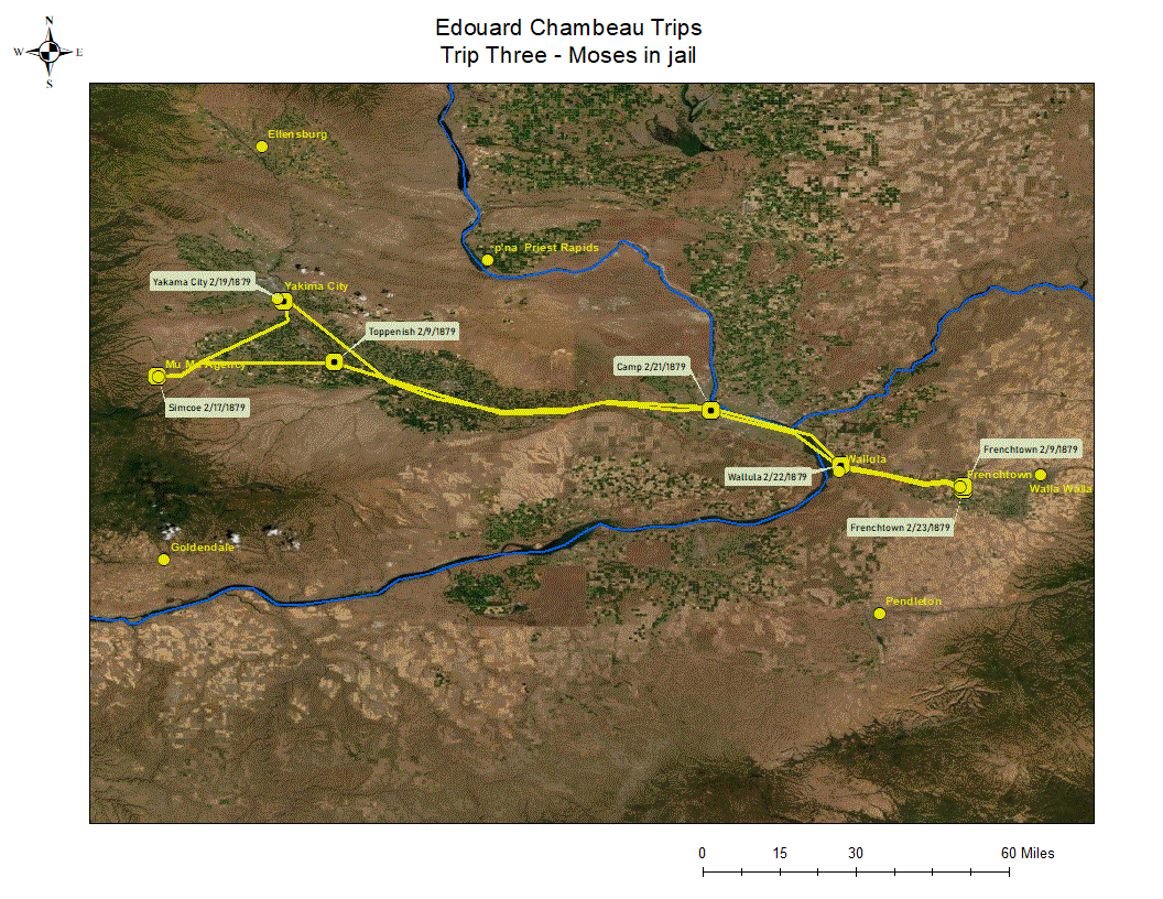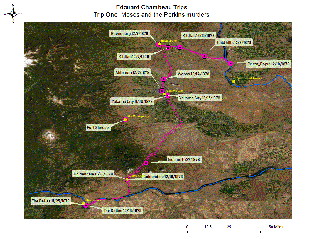 By unceasing inquiries and attentiveness to my business, I have found out a good deal. Homily’s friends and enemies, who he likes and who he hates. I am writing this at a Frenchman’s house 9 miles from Walla Walla. His name is St Dinnis, his wife is a relative of Homily’s. At 10 o’clock at night, some of the crowd is drunk. Pambrun is here, but he doesn’t know my business. I think I will find out much. There is a half breed named Abraham Gervis, a horse thief, among the Indians somewhere. Pel-e-cap-pet is the young Indian who Pambrun got to go see what the Indians were doing during the war last summer. I am sure that Pambrun never went himself, he stayed drunk at Wallula. This I got from an old friend of mine, Ramond, the best interpreter in the country. Pambrun promised several of the Indians money, and even promised Homily something, but as I learn, they never got anything. This is very wrong. Did you tell him to go and see Moses?