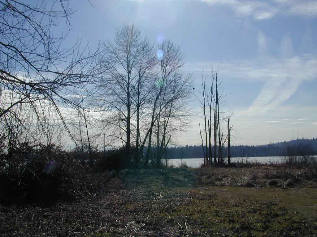 Low winter water levels expose soils along Juanita Bay. Eagles like to