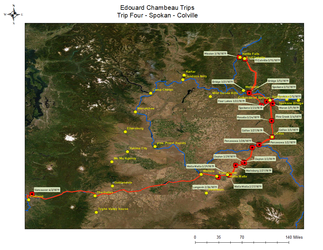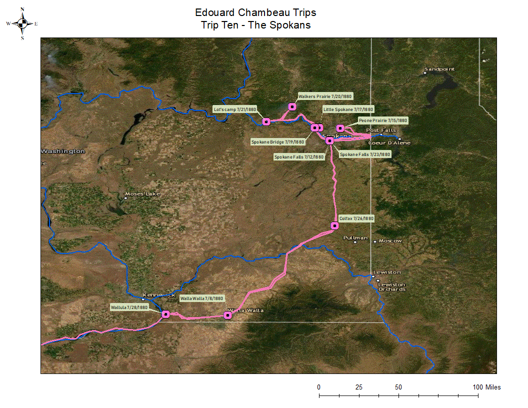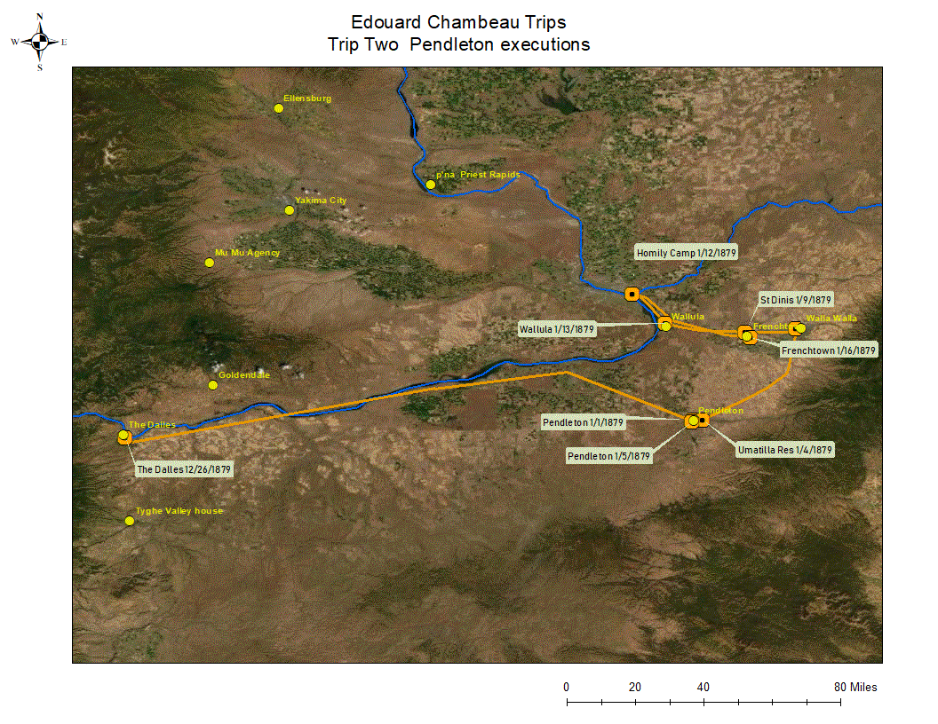 By unceasing inquiries and attentiveness to my business, I have found out a good deal. Homily’s friends and enemies, who he likes and who he hates. I am writing this at a Frenchman’s house 9 miles from Walla Walla. His name is St Dinnis, his wife is a relative of Homily’s. At 10 o’clock at night, some of the crowd is drunk. Pambrun is here, but he doesn’t know my business. I think I will find out much. There is a half breed named Abraham Gervis, a horse thief, among the Indians somewhere. Pel-e-cap-pet is the young Indian who Pambrun got to go see what the Indians were doing during the war last summer. I am sure that Pambrun never went himself, he stayed drunk at Wallula. This I got from an old friend of mine, Ramond, the best interpreter in the country. Pambrun promised several of the Indians money, and even promised Homily something, but as I learn, they never got anything. This is very wrong. Did you tell him to go and see Moses?
