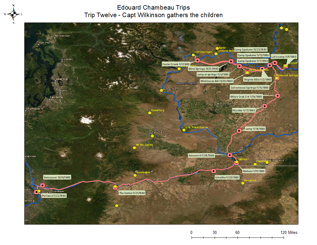 October 18, 1880. Monday morning I left Vancouver for the new post at the mouth of the Spokane River in company with General Howard, Capt Eladen and Capt Wilkinson.